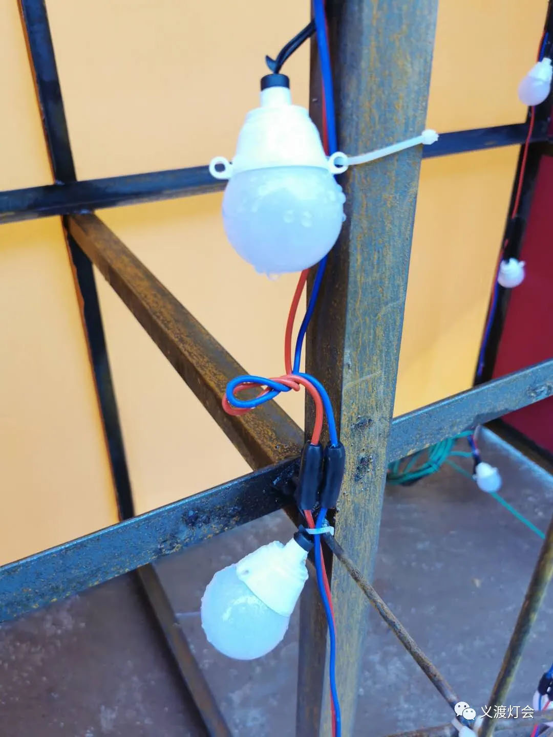 “你看现在他们都在雨里,不怕的,所有电线和配件都是针对彩灯行业的专供:防雨、低压。一个小灯泡3到5瓦,也是专门的防高温灯泡,即使是在天气炎热的情况下开展,也能保证游客不会像在摄影棚里观赏那么闷热,且极大地减少了隐患,而且相当省电。”
